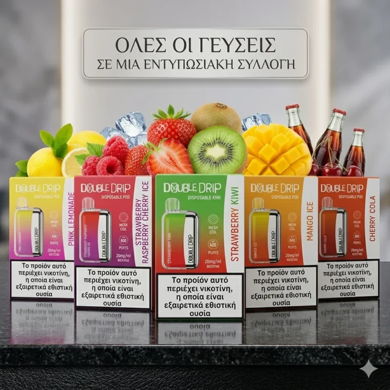 Εξερευνήστε σήμερα τη συλλογή Double Drip Disposable Pod και ανακαλύψτε τον ιδανικό τρόπο να απολαύσετε το άτμισμα, οπουδήποτε και οποτεδήποτε, με στυλ και ευκολία.